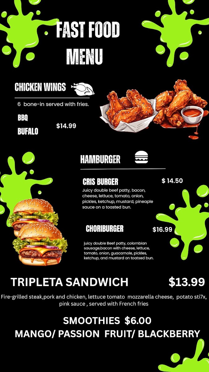 Juicy double Beef patty, colombian chorizo, bacon, cheese, lettuce, tomato, onion, guacamole, ketchup, and mustard on toasted bun.
