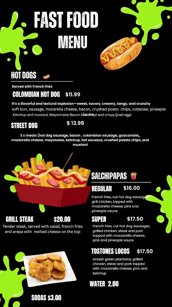 3 x meats (hot dog sausage, bacon, colombian sausage, guacamole, mozarrella cheese, mayonaise, ketchup, hot sausace, crushed potato chips, and mustard